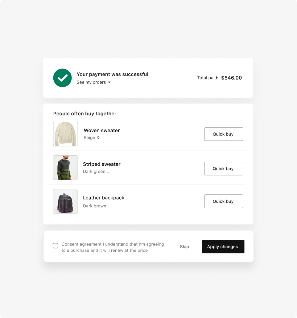 Maximize your sales potential with Post Purchase Upsell feature! After completing their payment, customers are presented with targeted product suggestions, tailored to either the content of their initial purchase or its price. Seize the opportunity to increase sales by offering relevant products at the perfect moment, enhancing the overall shopping experience for your customers.